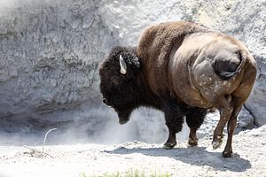 A male bison enjoying the steam from a mudpot in Yellowstone National Park
