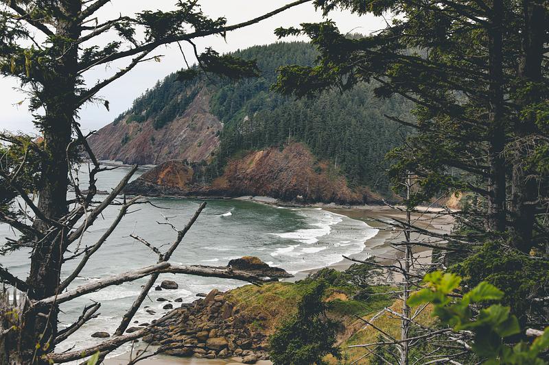 A cliff-side view of the beach at Ecola State Park in Oregon, near Cannon Beach.